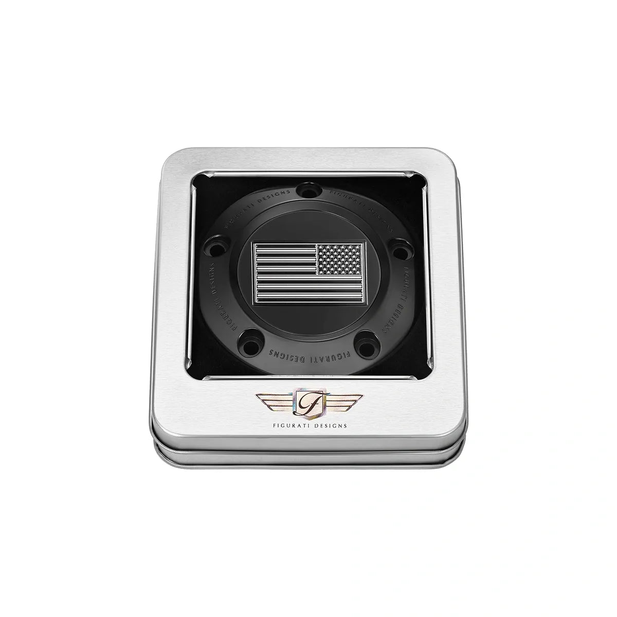 Lleve su tapa de distribución al siguiente nivel con una bandera estadounidense con corte en contraste de Figurati Designs, invertida, cubierta de distribución personalizada, hecha de acero inoxidable 316L en negro.