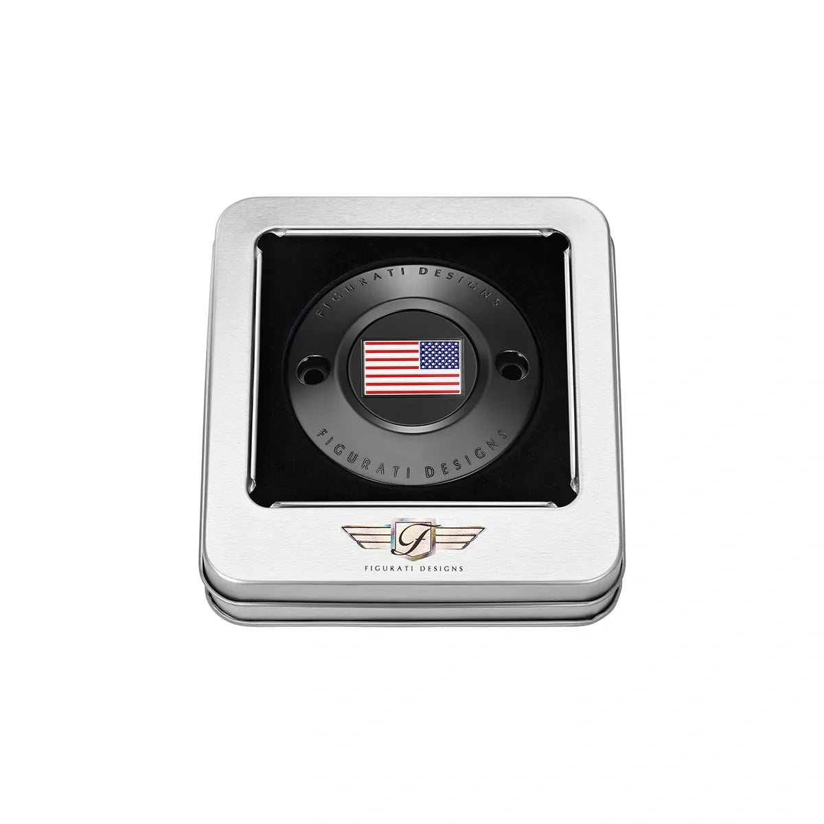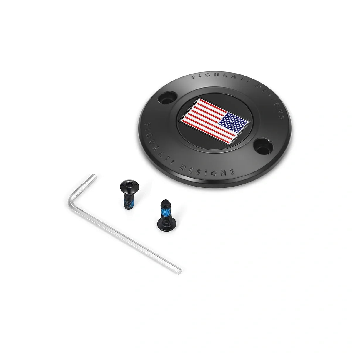 Lleve su tapa de sincronización al siguiente nivel con una tapa de sincronización personalizada con bandera estadounidense roja, blanca y azul de Figurati Designs, invertida, hecha de acero inoxidable 316L en negro.