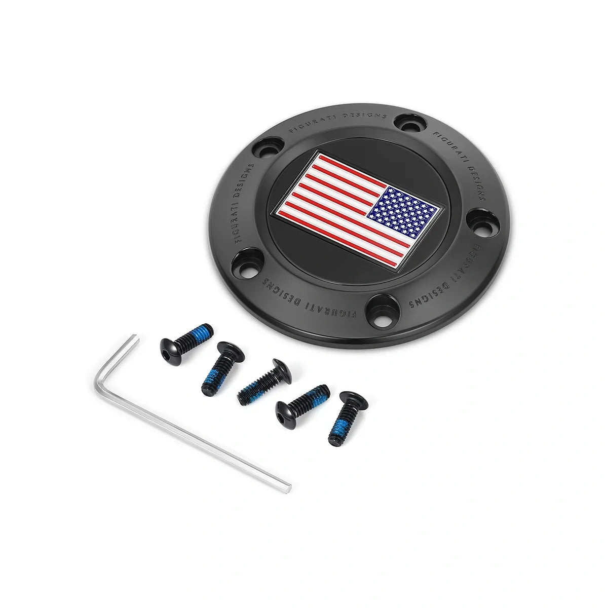 Lleve su tapa de sincronización al siguiente nivel con una bandera estadounidense roja, blanca y azul de Figurati Designs - invertida - Tapa de sincronización personalizada, hecha de acero inoxidable 316L en negro.
