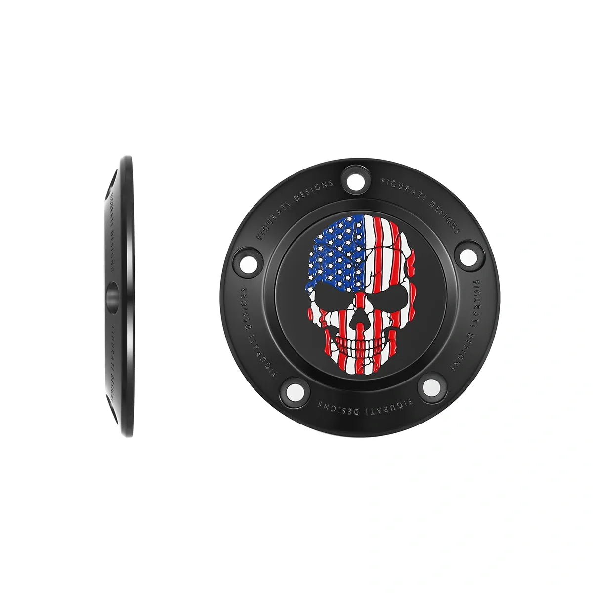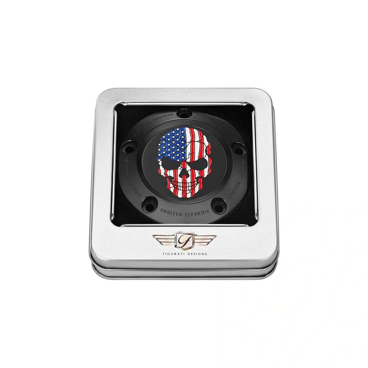 Lleve su tapa de sincronización al siguiente nivel con una tapa de sincronización personalizada con calavera de bandera estadounidense roja, blanca y azul de Figurati Designs, hecha de acero inoxidable 316L en negro.