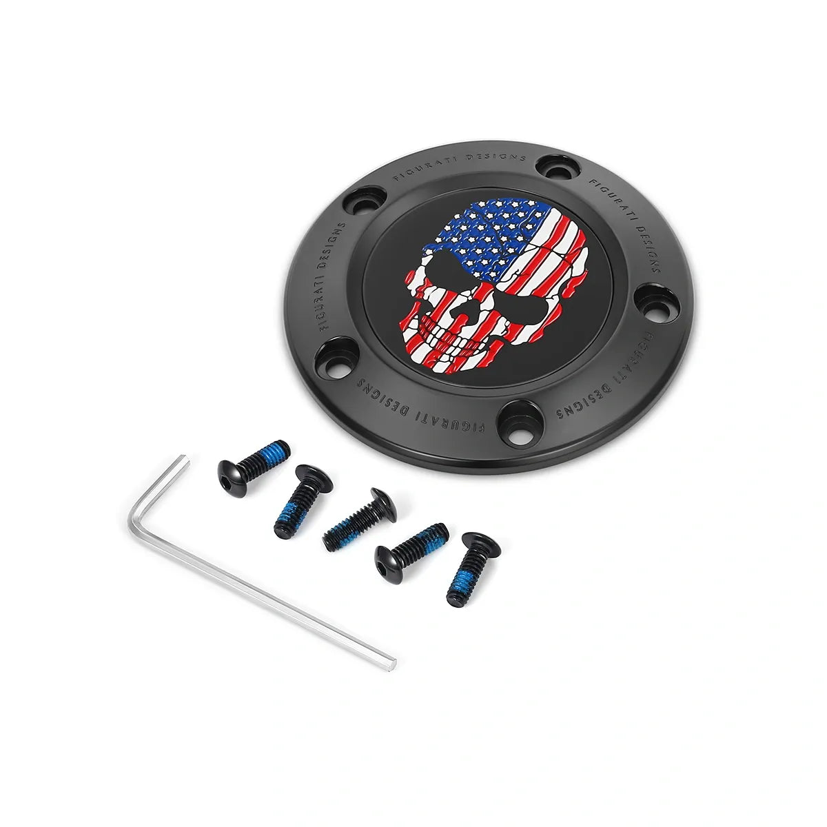 Cubierta de sincronización Harley-Davidson de acero inoxidable en negro, rojo, blanco y azul con calavera y bandera americana Twin Cam