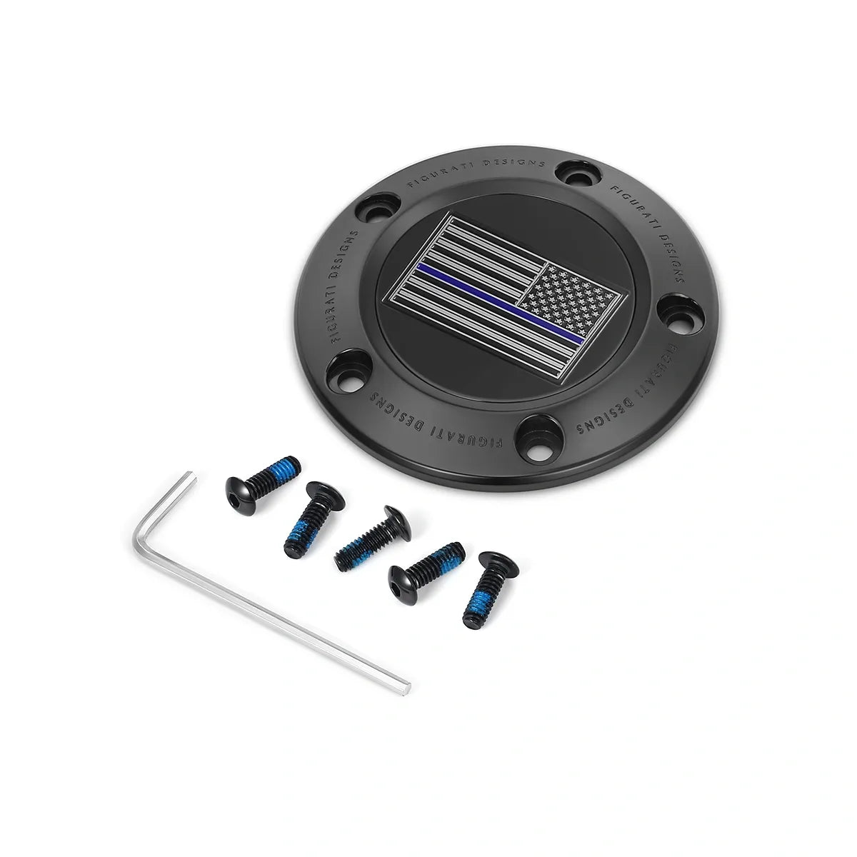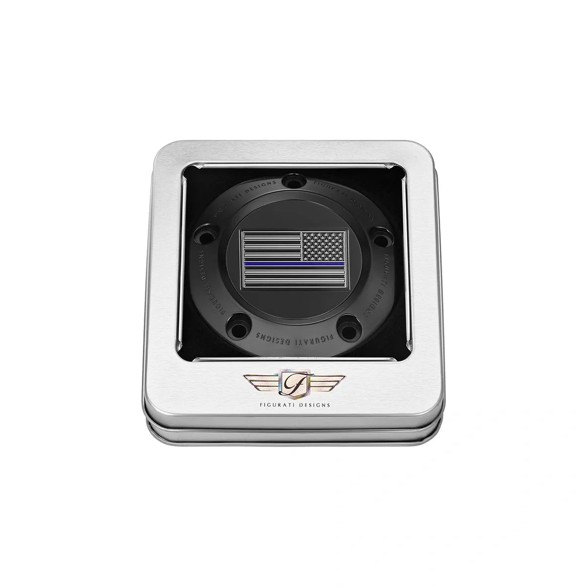 Lleve su tapa de distribución al siguiente nivel con una cubierta de distribución personalizada con bandera estadounidense Blue Line de Figurati Designs, invertida, hecha de acero inoxidable 316L en negro.
