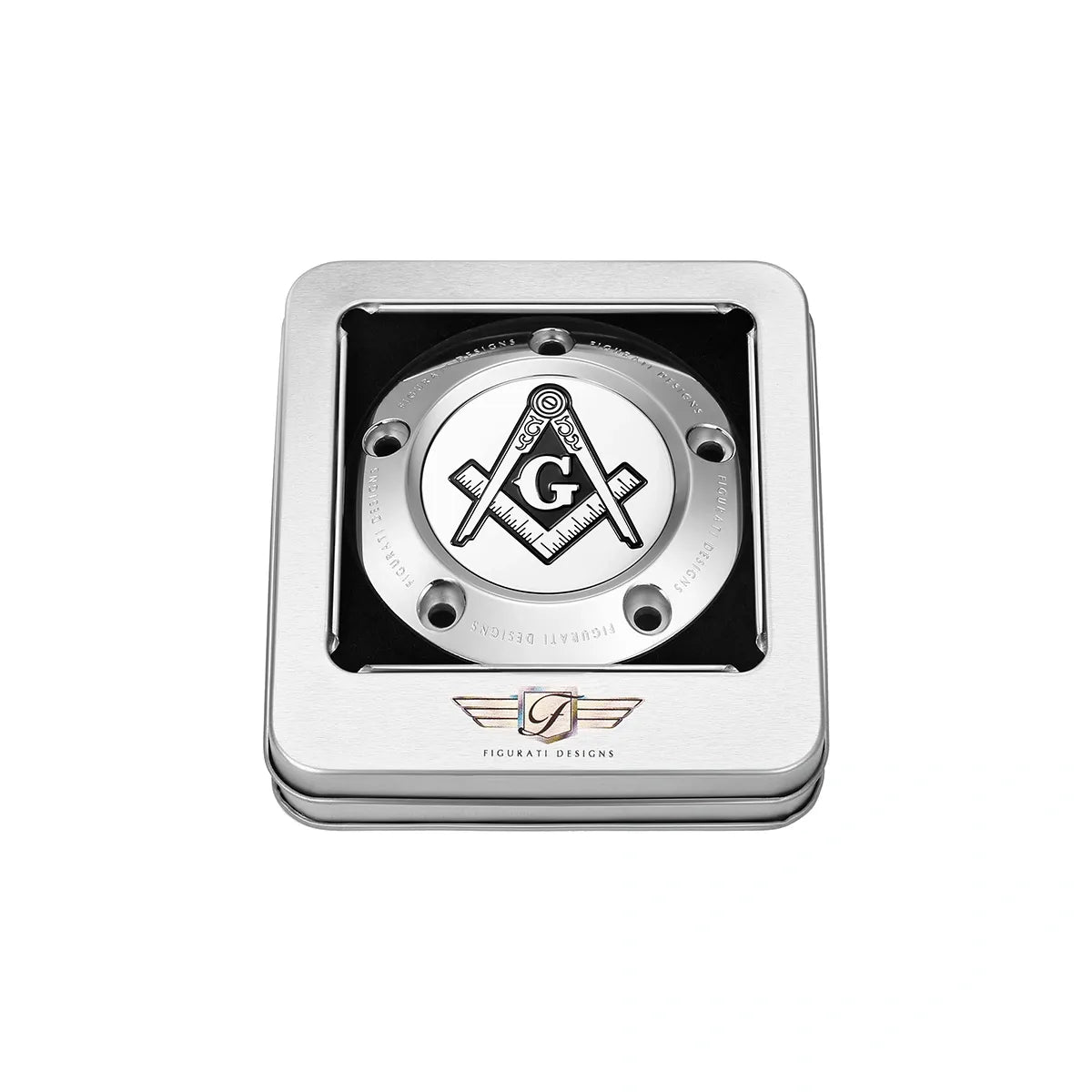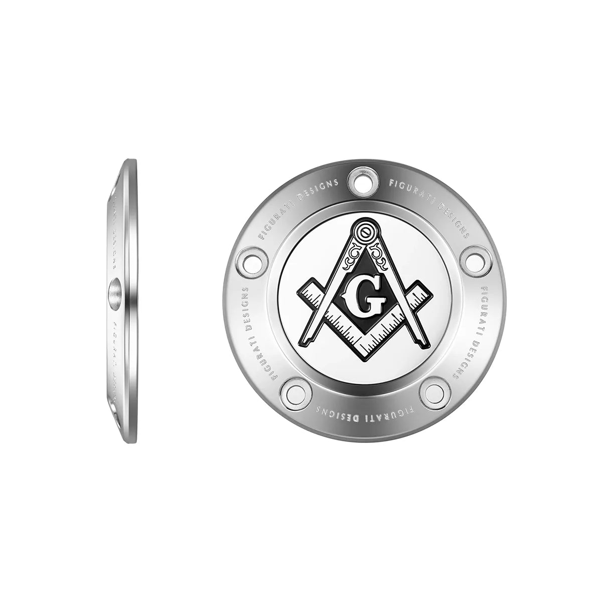 Lleve su tapa de sincronización al siguiente nivel con una tapa de sincronización personalizada con emblema masónico de Figurati Designs, hecha de acero inoxidable 316L, pulida hasta obtener un acabado de espejo perfecto.
