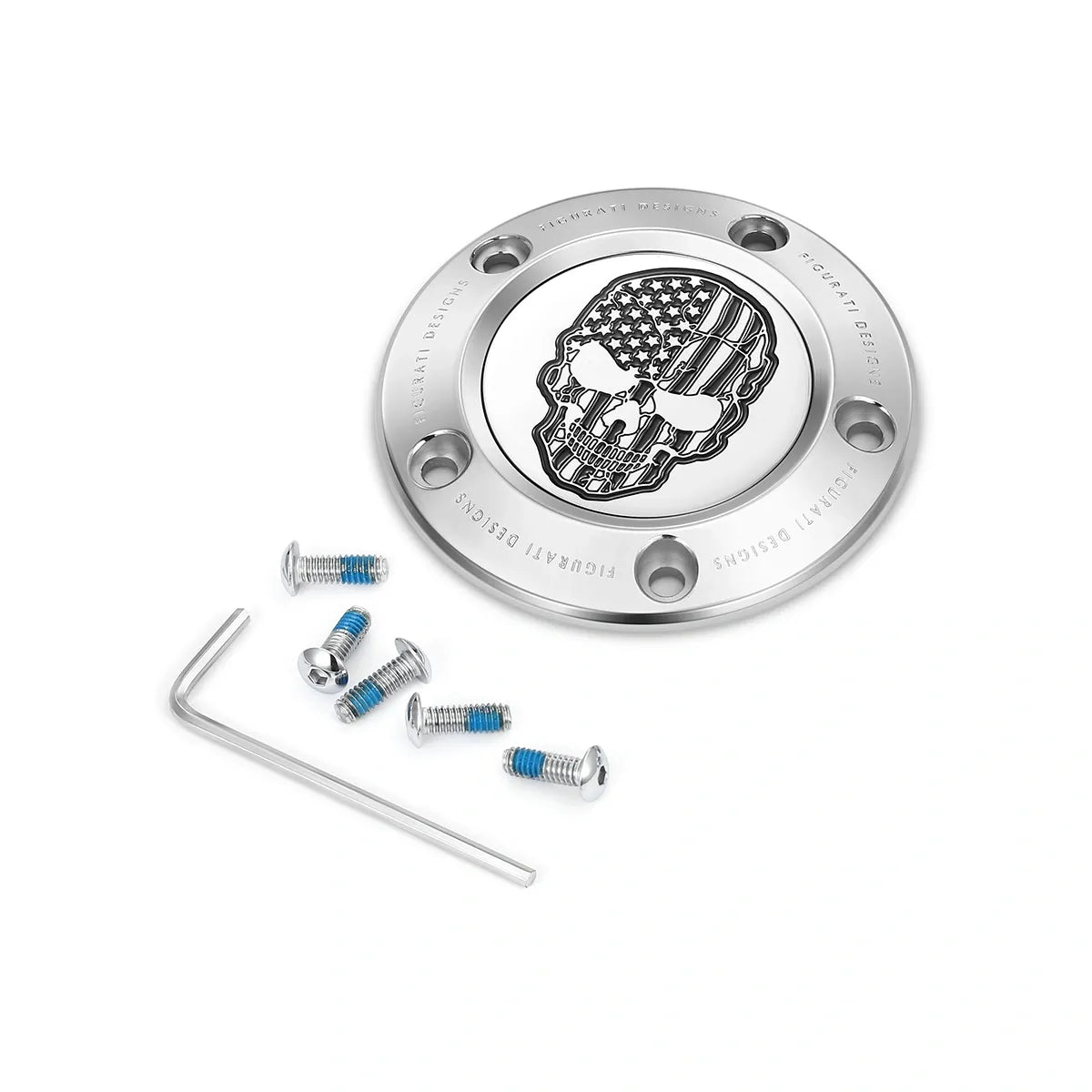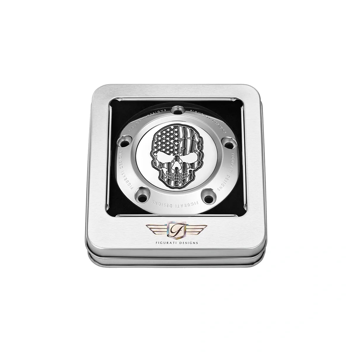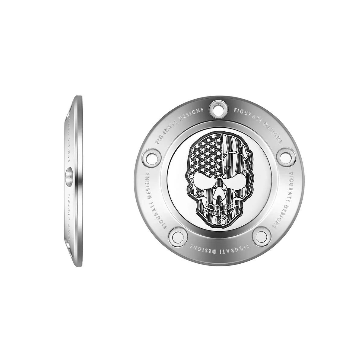 Figurati Designs 对比切割美国国旗骷髅定制计时盖将您的计时盖提升到一个新的水平,该计时盖由 316L 不锈钢制成,抛光至完美的镜面效果。