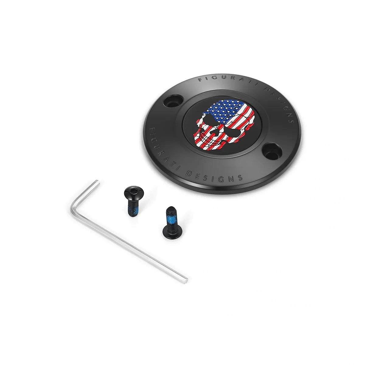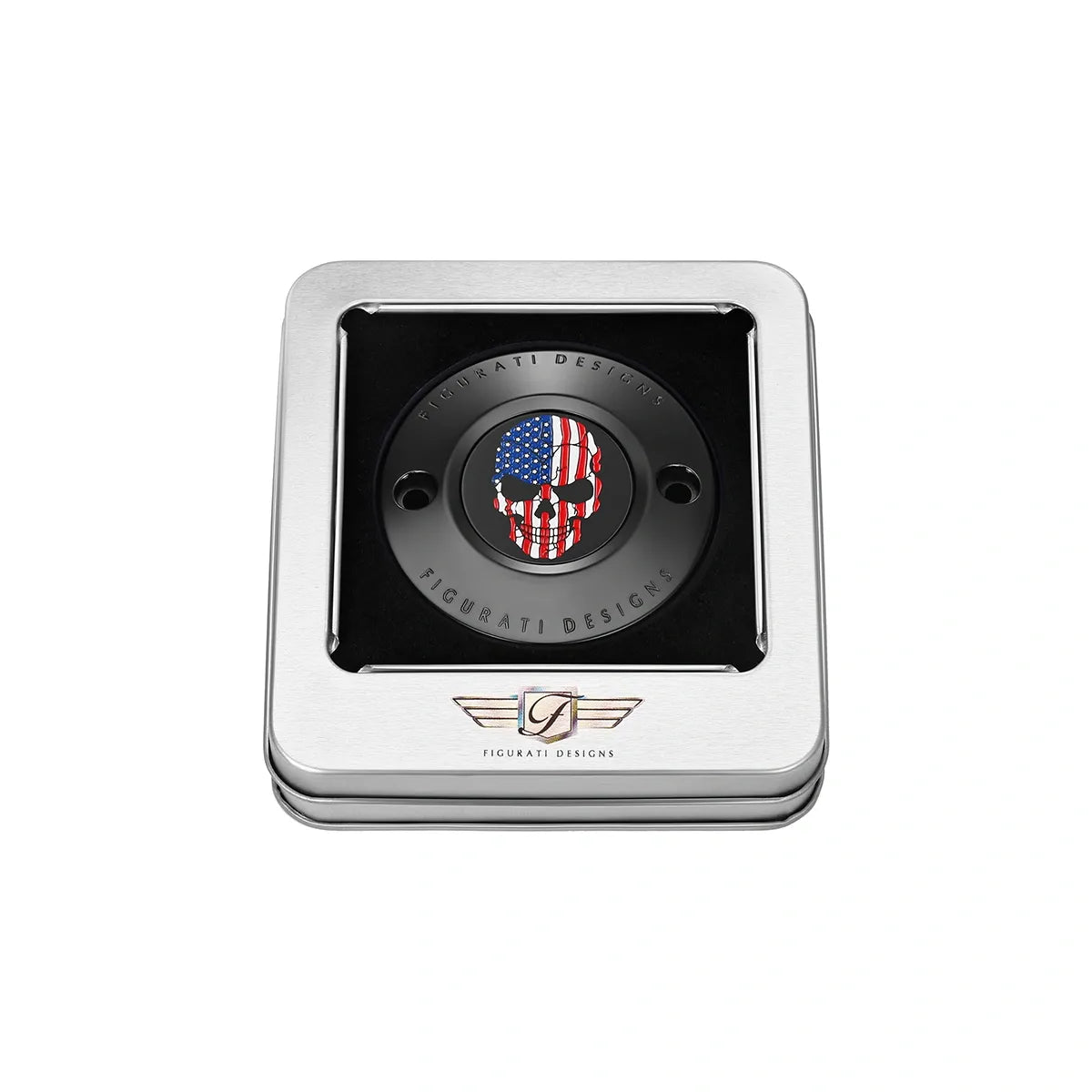 Figurati Designs 定制红白蓝美国国旗骷髅正时盖采用黑色 316L 不锈钢制成,将您的正时盖提升到一个新的水平。